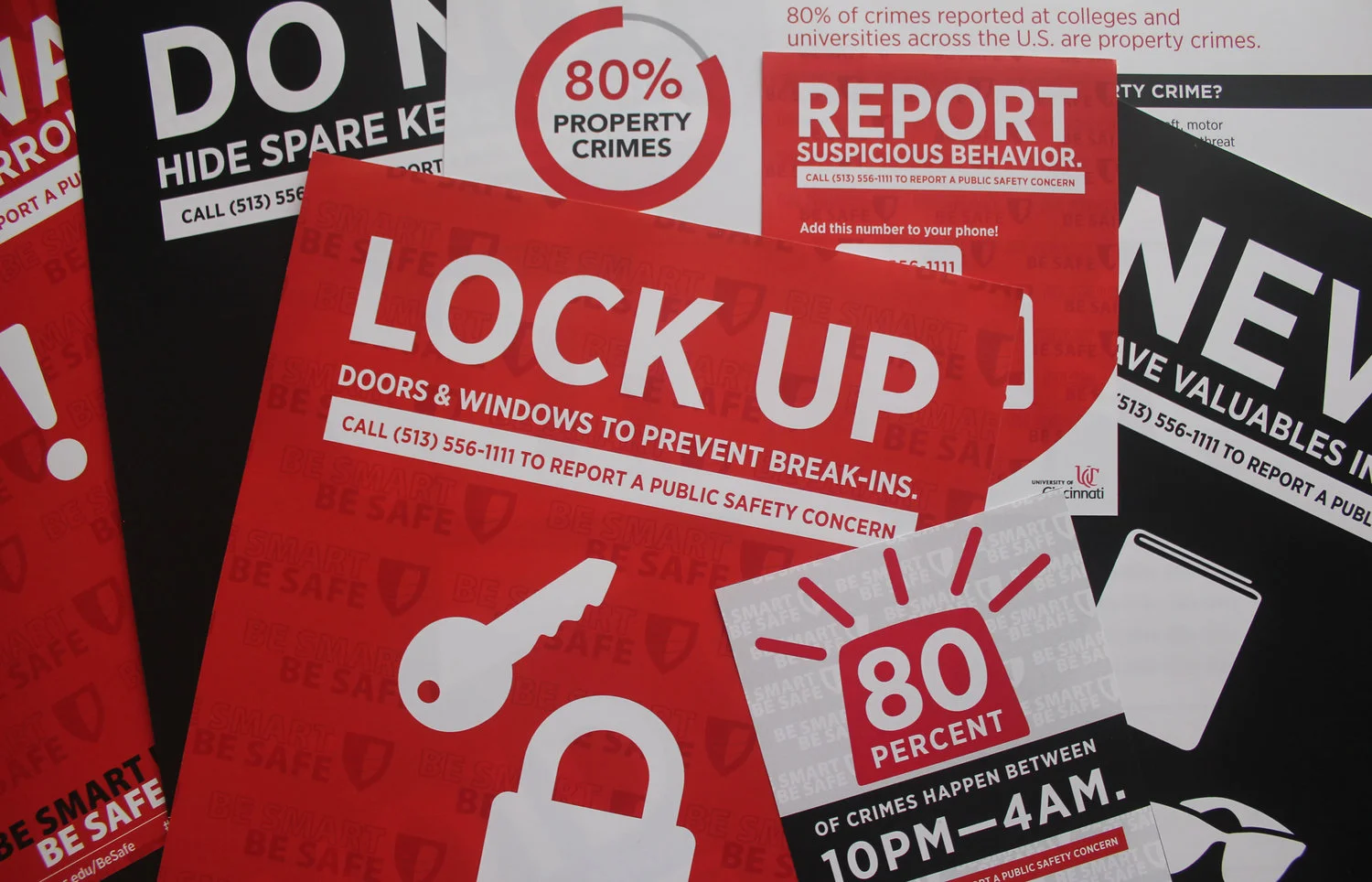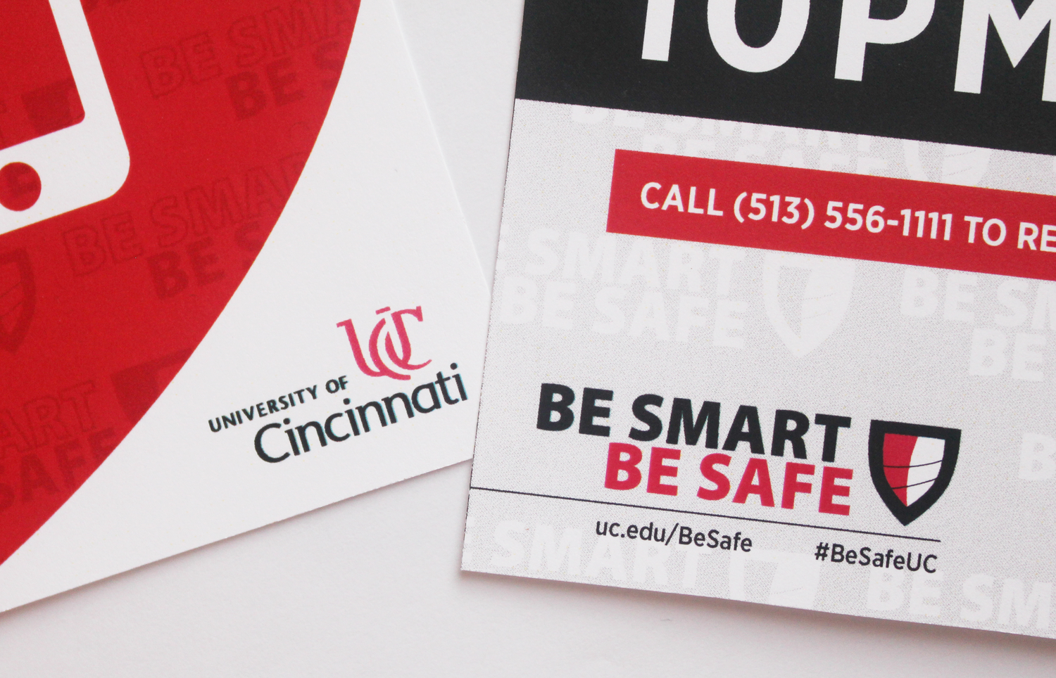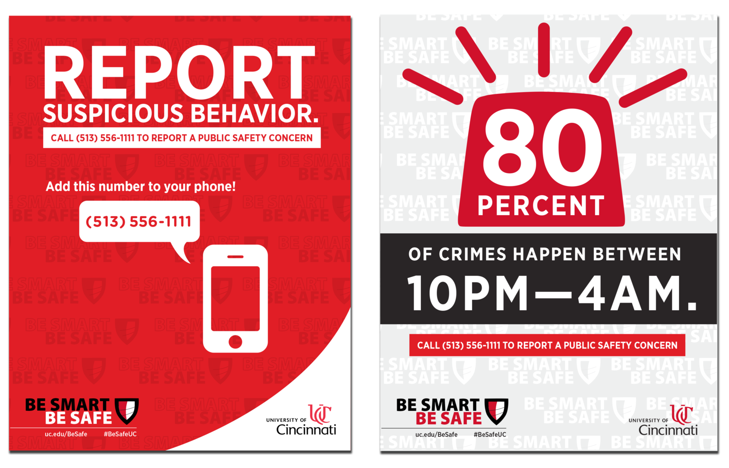 To capture the attention of busy college students, campaign messaging needed to be bold and impactful. It also needed to tie in with the University of Cincinnati academic brand. I leveraged a guerrilla marketing campaign approach, developing posters, social media graphics, and other methods of bold disruption that urged students to take precautions around campus while advertising new safety resources.