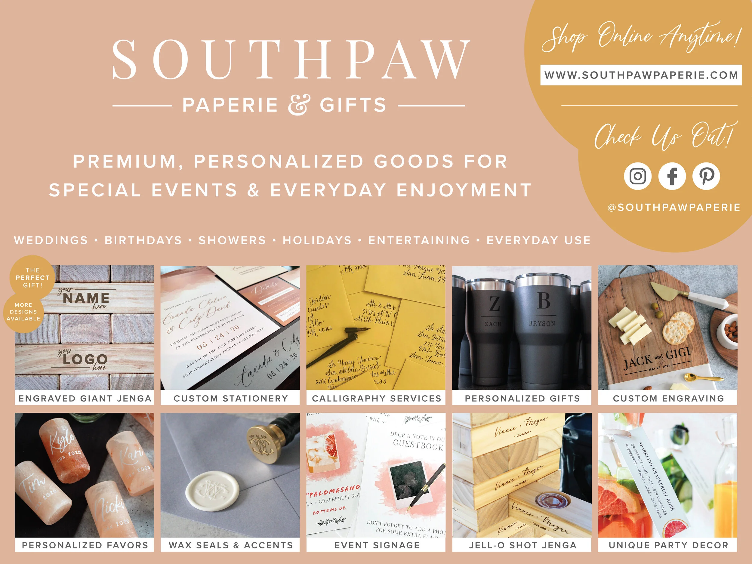 In 2019, my husband and I hosted our destination wedding in wine country — an event we designed less for ourselves and more as an unforgettable experience for our guests. From fully custom stationery and signage to personalized favors and an interactive scavenger hunt, I created thoughtful touchpoints to surprise and delight at every turn. After returning home, I found myself missing the creative energy that had fueled the wedding, so I launched an Etsy shop to share the handcrafted goods that had resonated so strongly — and Southpaw Paperie & Gifts was born. With a name inspired by my left-handedness, Southpaw Paperie reflects my passion for bespoke design.