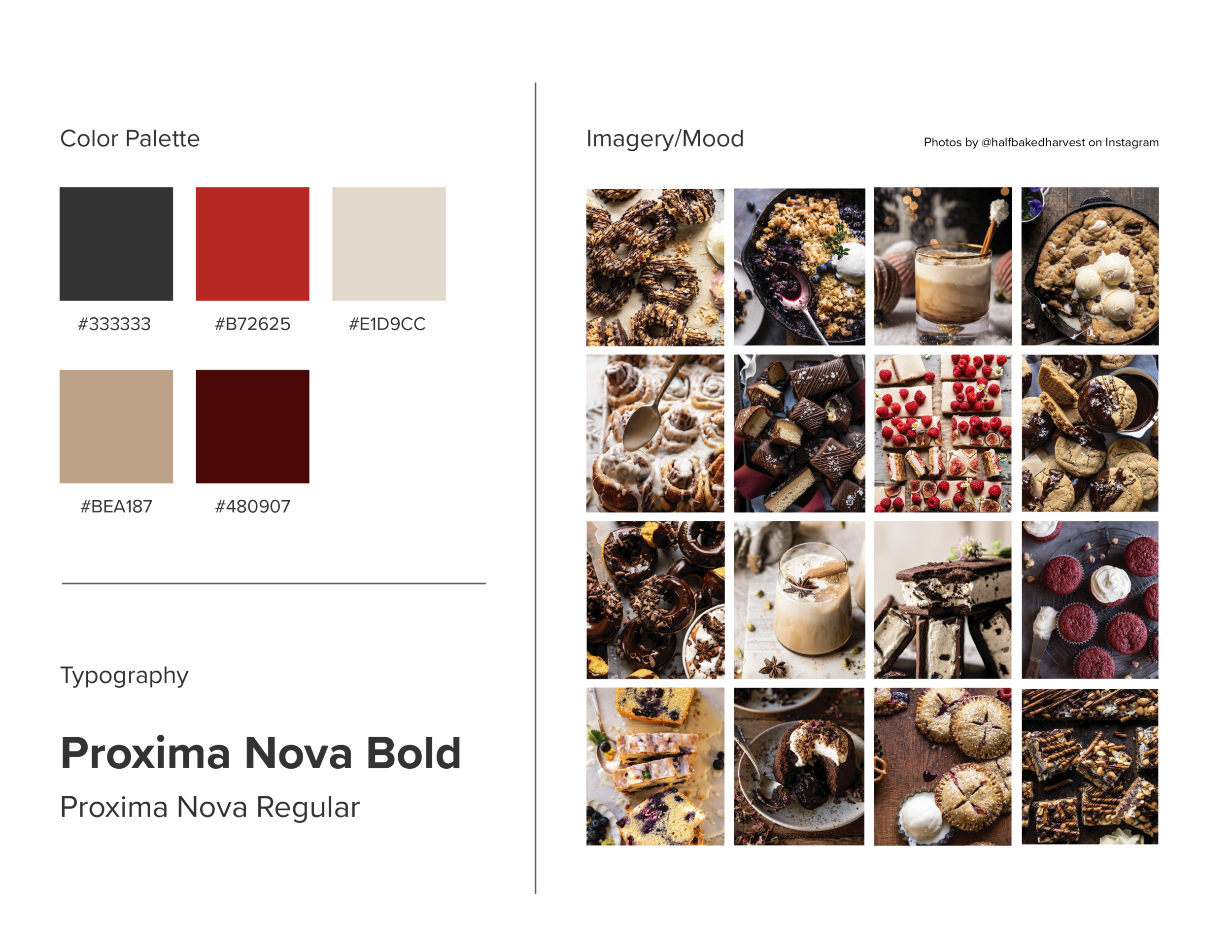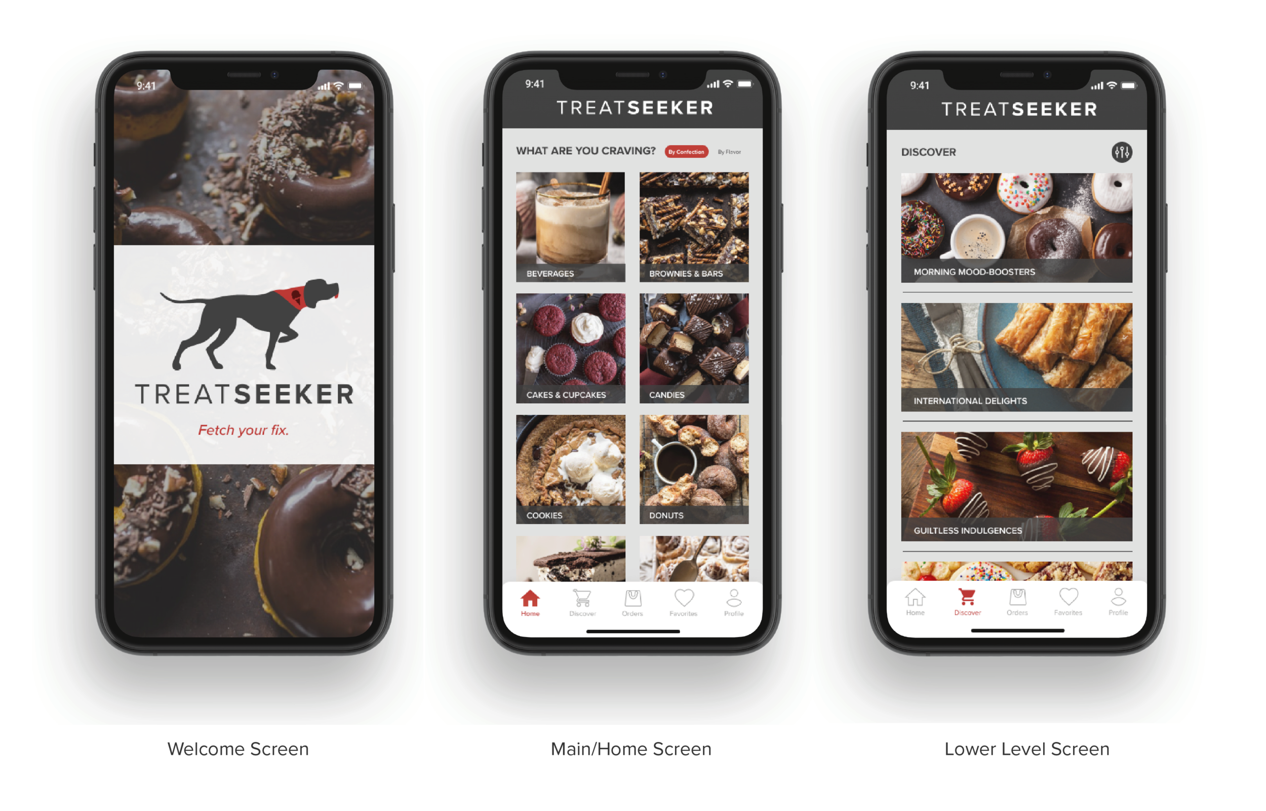 After setting up the brief for the project (determining the app’s purpose, tagline, etc.), I set out to create the visual identity for TreatSeeker using Adobe Illustrator. I opted for a dark, moody color palette featuring rich grays, creams, and reds to instill feelings of indulgence — like biting into a rich red velvet cupcake. The color red has also been found to drive appetite.I also gathered imagery similar to what I envisioned would be featured on the app: rich, indulgent images that complement the colors chosen in the app’s visual palette.